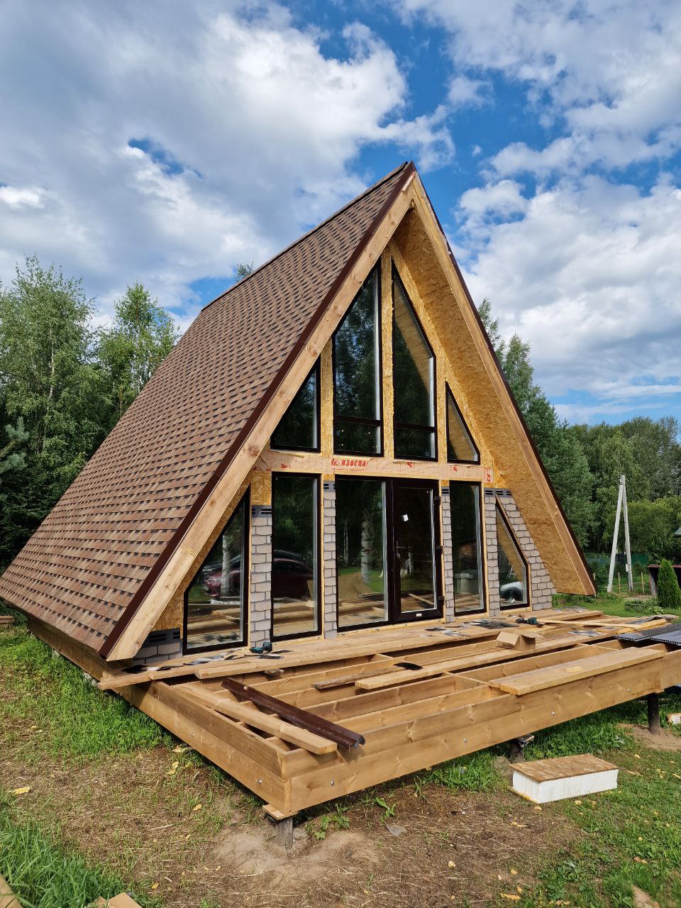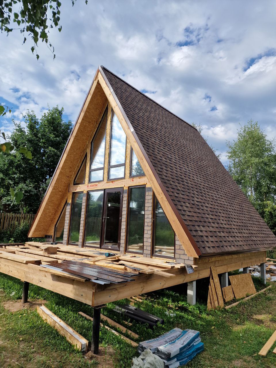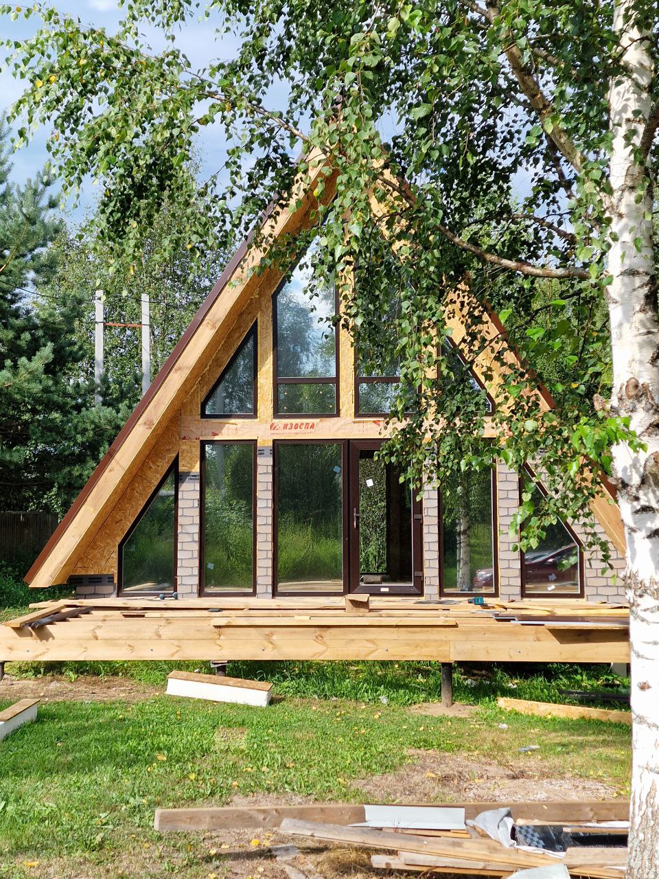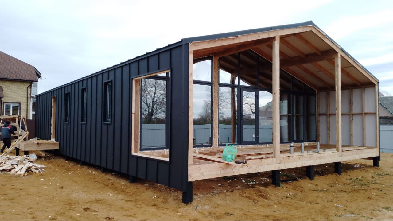 Смонтируем выбранную кровлю, установим стеклопакеты и двери
